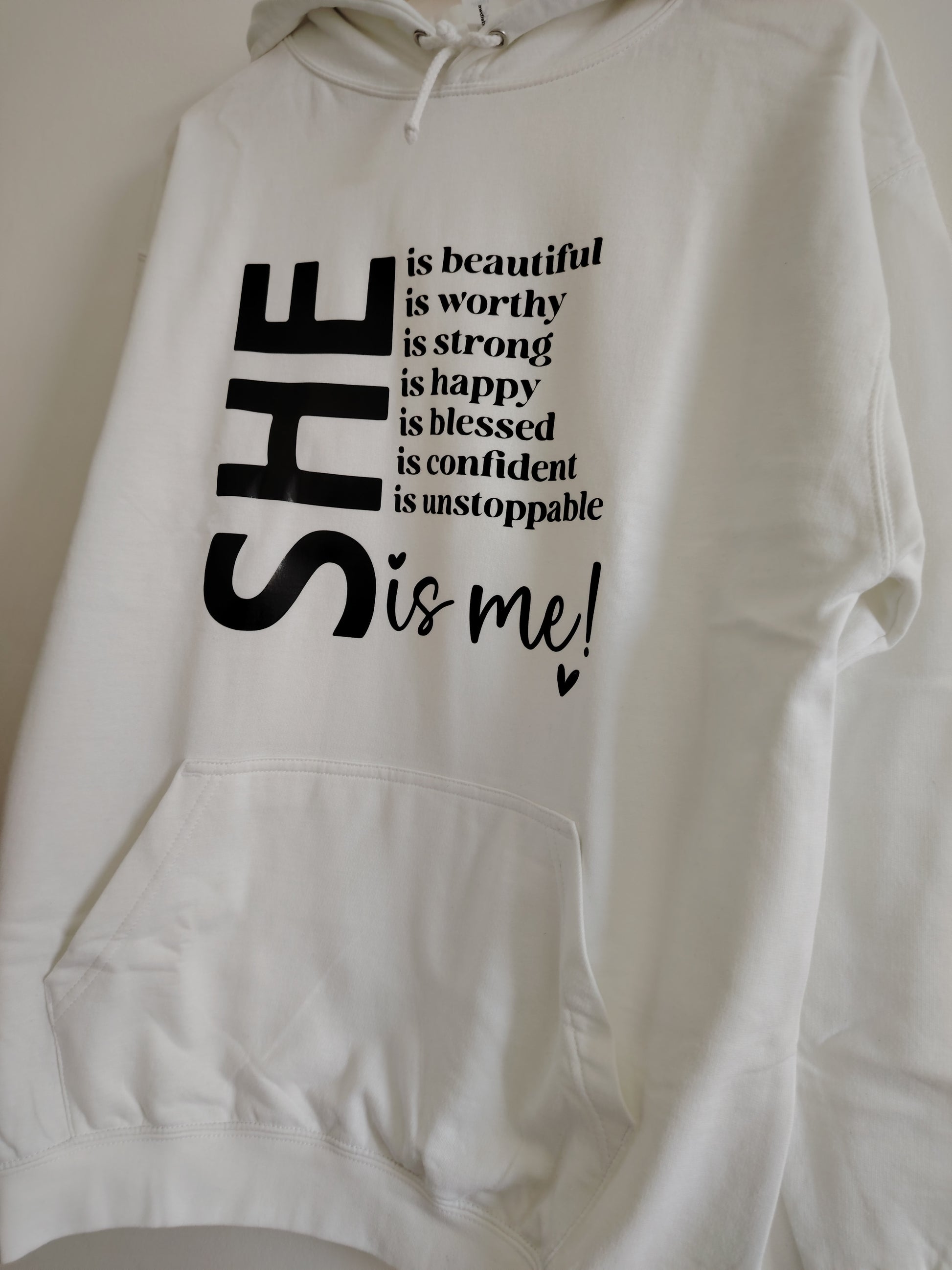 Celebrate strength, beauty, and confidence with our SHE is Me hoodie. Featuring an empowering affirmation design that reads “SHE is beautiful, is worthy, is strong, is happy, is blessed, is confident, is unstoppable – SHE is me!”, this motivational hoodie is made to inspire women every day.