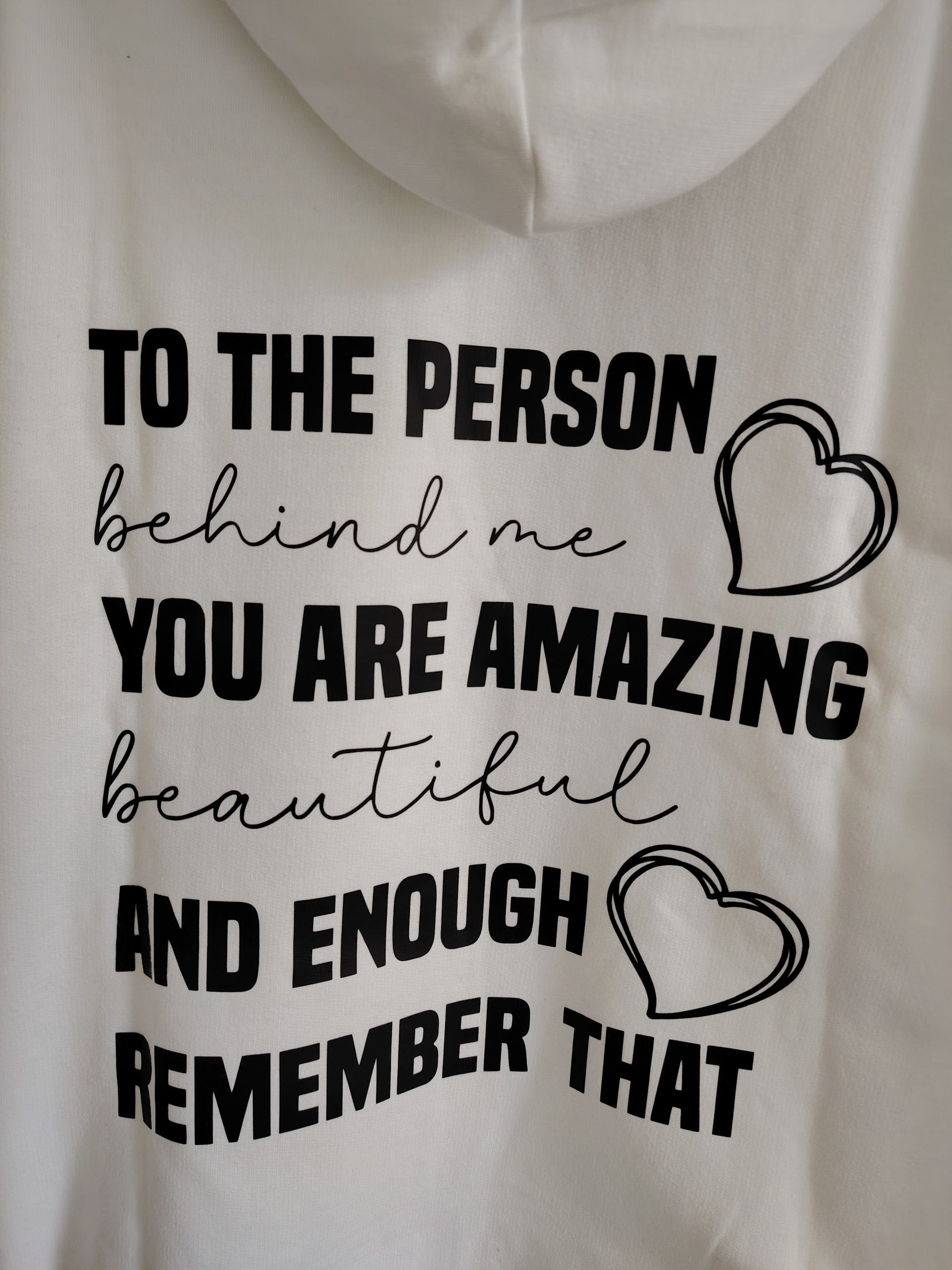 Back print: “To the person behind me: You are amazing, beautiful, and enough. Remember that.”